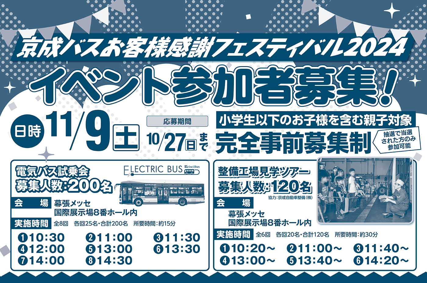 11/9(土)開催の「京成バスお客様感謝フェスティバル2024」にて、「電気バス試乗会」「整備工場見学ツアー」を実施いたします。皆様のたくさんのご応募をお待ちしております。
